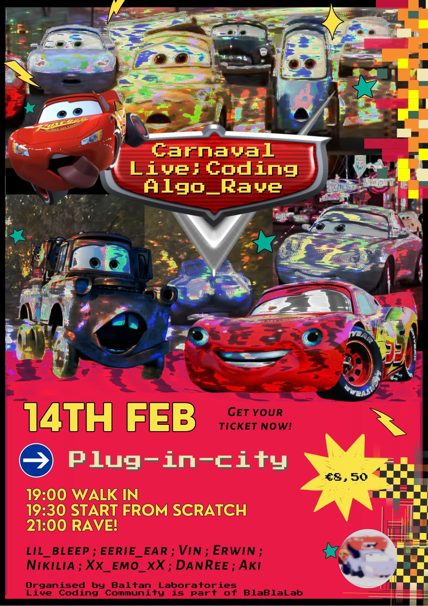 This carnival, Baltan Laboratories invites you to an unforgettable alternative to the typical Dutch rave. 🎡 On Saturday, February 14th, from 19:00–00:00, Blablalab’s Live Coding community merges algorithmically composed music and visuals with the glorious absurdity of Cars 2.